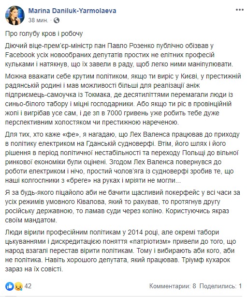 Вице-премьеру в соцсети ответила телеведущая и блогер Марина Данилюк-Ярмолаева. «Ваш пост ниций и противный», — подчеркнула она в комментарии. А затем в отдельном посте отметила, что далеко не всем талантливым людям посчастливилось родиться в состоятельной киевской семье: