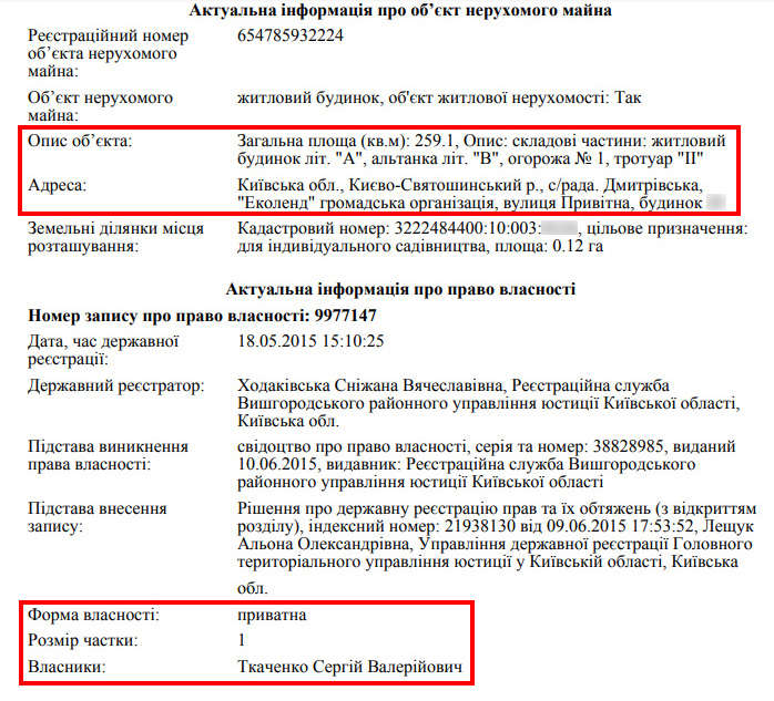 До речі, Наталія Євгенівна у 2015 році також переїхала до приватного будинку у селі Дмитрівка, що неподалік Києва. Села, яке облюбували різномасті блатні: прокурори, керманичі «Укравтодору» та Сергій Арбузов. Маєток за 1,35 млн грн записаний на чоловіка – Ткаченка Сергія Валерійовича.