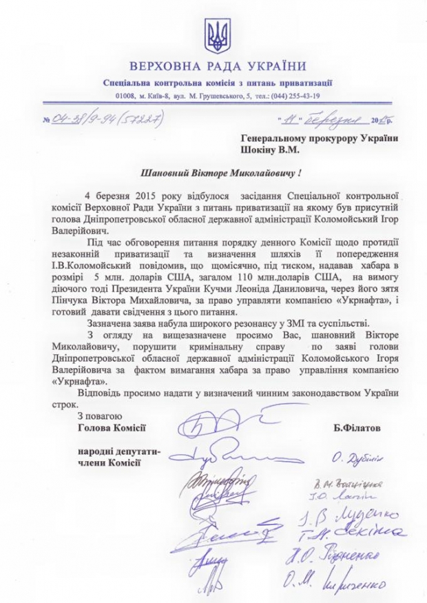 Председатель Днепропетровской ОГА Игорь Коломойский дал контрольной комиссии ВР документы, которые подтверждают получение Леонидом Кучмой ежемесячного взятки в сумме $5 млн. В частности, Игорь Коломойский признается, что за право управлять компанией "Укрнафта" вынужден был под давлением давать взятку действующему тогда президенту Леониду Кучме за его зятя Виктора Пинчука.