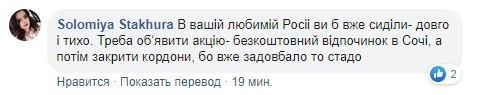 "В вашій любимій Росіі ви б вже сиділи- довго і тихо. Треба об‘явити акцію- безкоштовний відпочинок в Сочі, а потім закрити кордони, бо вже задовбало то стадо", - Solomiya Stakhura