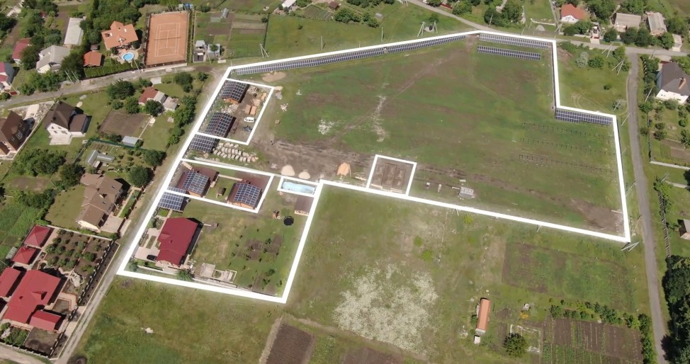 Все четыре дома хорошо видно с воздуха. На территории заметен фундамент для пятого коттеджа. На крышах домов, а также на земле рядом строятся солнечные панели.