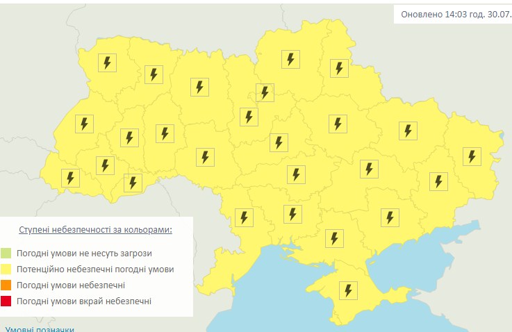 У середу, 31 липня в Україні майже в усіх областях очікуються сильні дощі, жовтий рівень метеорологічної небезпеки при цьому збережеться.