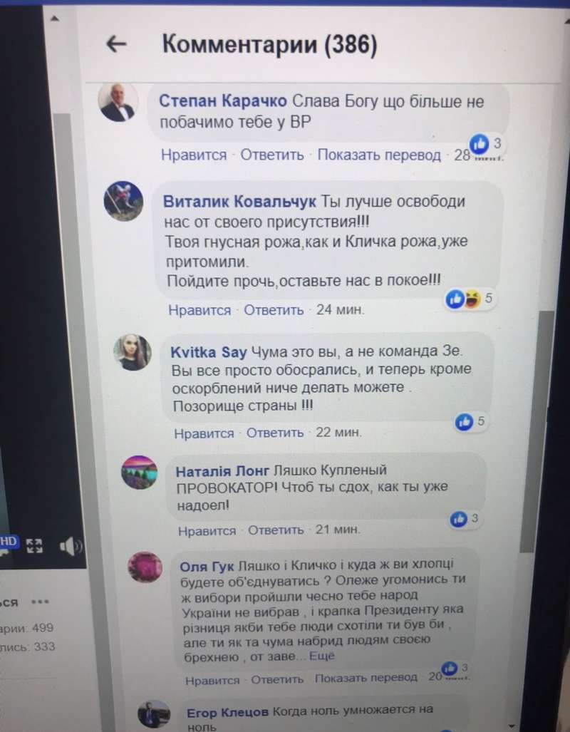Кроме того, пользователь Степан Карачко написал, что Слава Богу, что больше украинцы не увидят Олега Ляшко в парламенте, а Виталик Ковальчук попросил лидера «Радикальной партии» уйти прочь и оставить всех в покое, так как они с Виталием Кличко «уже всех притомили».