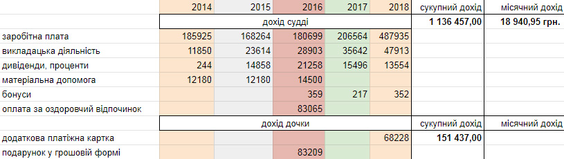 Мы посчитали совокупный доход Оксаны Блаживской и ее дочери за 2014, 2015, 2016, 2017 и 2018 годы по декларациям, которые она подавала как судья Хозяйственного суда города Киева. Бюджет семьи формировался преимущественно из судейской заработной платы и преподавательской деятельности. Дополнительно Оксана Евгеньевна имела процентные выплаты по банковским вкладам.