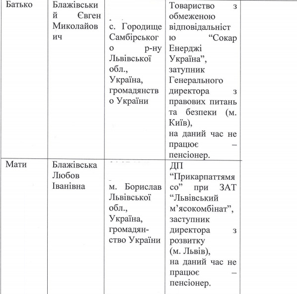 Как видно из судейского досье кандидата, отец Блаживский Евгений Николаевич работал заместителем гендиректора в ООО «Сокар Энерджи Украина» - ныне пенсионер. В то же время ему посвящена целая статья в «Википедии», из которой следует, что он бывший прокурор: долгое время работал в прокуратурах Львовской области, а за Виктора Пшонки стал его заместителем в ГПУ. Возможно, именно этим обусловлен быстрый карьерный рост Оксаны Блаживской, которая после назначения отца в Генпрокуратуру резко «переоделась» в судейскую мантию.
