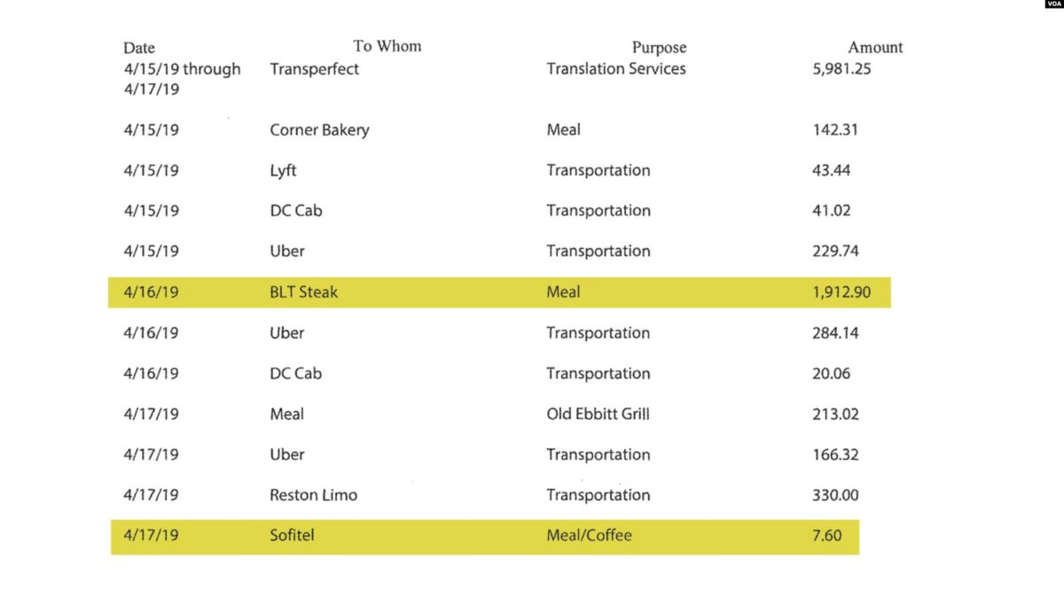 16 апреля состоялся ужин в одном из вашингтонских ресторанов на сумму $1,9 тыс., отмечаются расходы на такси и лимузин.