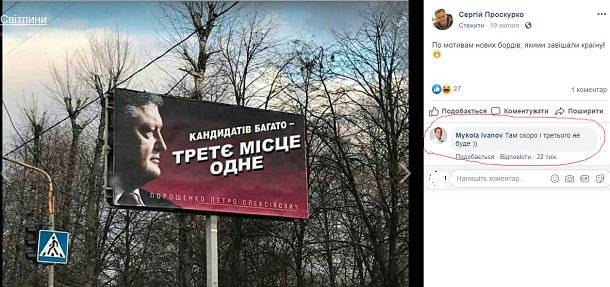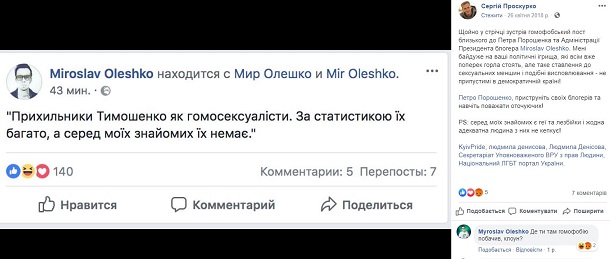 Тролль Проскурко очень не любит Петра Порошенко. Он ссорится с блогером- «порохоботом» Мирославом Олешко, который, в свою очередь, нападает на «сторонников Тимошенко».