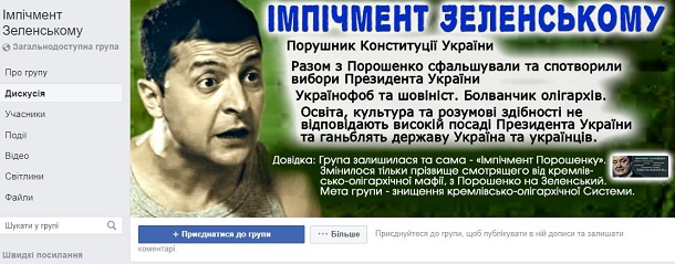 Еще тролль Сергей делает вид, что активно борется с «порохоботами» и публикует в различных пабликах о них информацию. Например, в группе, которая ранее называлась «Импичмент Порошенко», а теперь - «Импичмент Зеленскому». Президенты меняются, а группа своих целей не меняет. Стабильность.