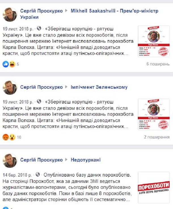 Тролль Приходько, «побратим» тролля Проскурка, также активно выступал против «порохоботов» и распространял информацию об этом во всех возможных группах. Кроме того, в 2017 году он массово распространял новость об «атаке на Юлю [Тимошенко]». И еще Иван делится, например, информацией о том, что «Тимошенко будет лично вести свою страничку на фейсбуке».