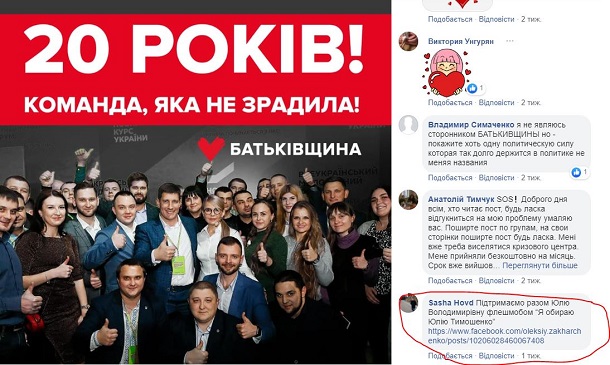 В издании «Детектор медиа» получили письмо о наборе кадров на фабрику троллей партии «Батькивщина». Это может быть правдой, хотя член партии и директор компании, которая оплачивает рекламу на фейсбуке Юлии Тимошенко, отрицал использование ими фейковых аккаунтов.
