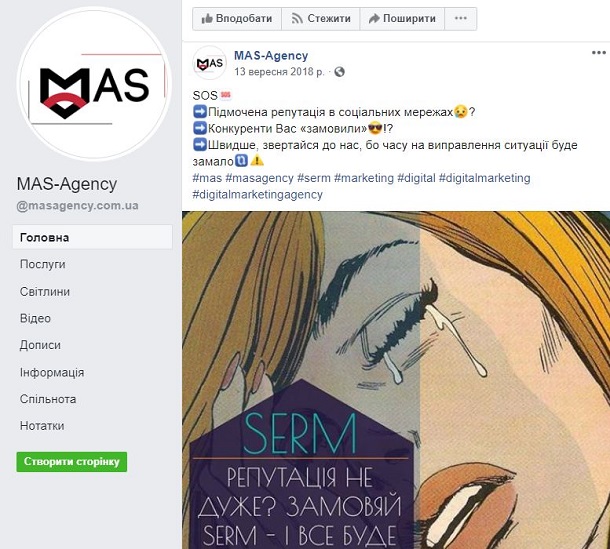 С начала своей активности в фейсбуке «Современные рекламные решения» активно продвигали услуги SERM (search engine reputation management). Что это такое? Например, улучшение репутации заказчика в интернете за счет вытеснения негативных упоминаний из поисковых запросов. «Современные рекламные решения» также предлагают аналогичные услуги и для социальных сетей.