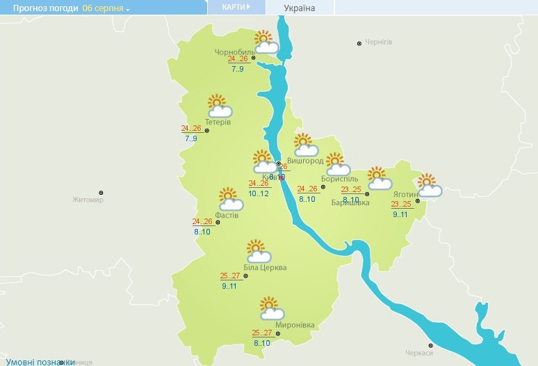В Киеве 6 августа ожидается переменная облачность, температура воздуха достигнет +24+26, а ночью ожидается +10+12.