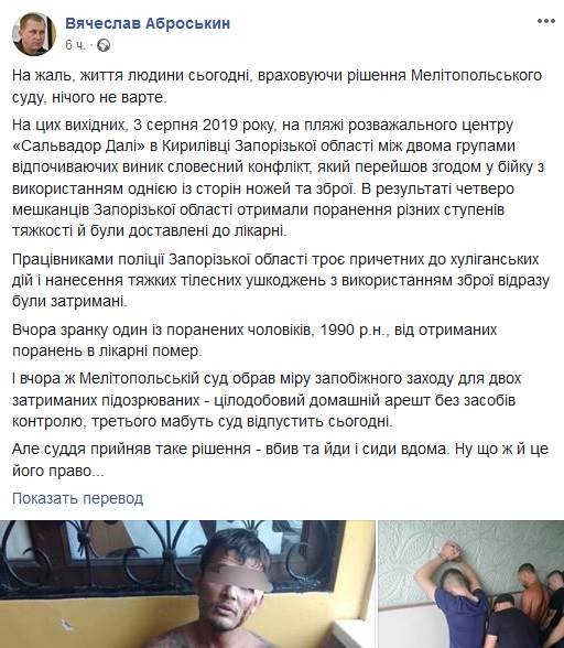 Не исключено, что за кровавой разборкой стоят и другие высокопоставленные правоохранители. О наличии у преступников «крыши» говорит и тот факт, что 5 августа Мелитопольский районнный суд отпустил под домашний арест двух подозреваемых. Хотя уже было известно о том, что пострадавший скончался. Оценку действиям суда уже дал Первый заместитель главы Национальной полиции Украины Вячеслав Аброськин, пока на своей странице в ФБ:
