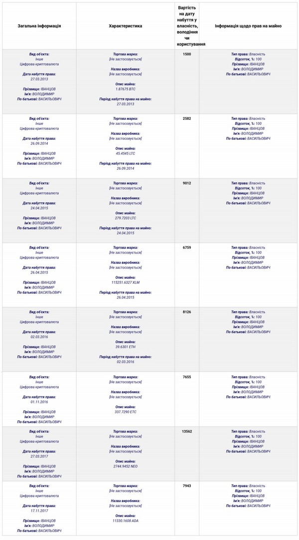 Кроме традиционного для многих описания движимого и недвижимого имущества, декларация Владимира Васильевича пестрит упоминанием о целом перечне принадлежащих именно ему криптовалютных сбережений, а именно: 1.87675 BTC, 45.4545 LTC, 279.7203 LTC, 115251.6327 XLM, 39.6301 ETH, 337.7290 ETC, 2744.9452 NEO, 11330.1608 ADA.