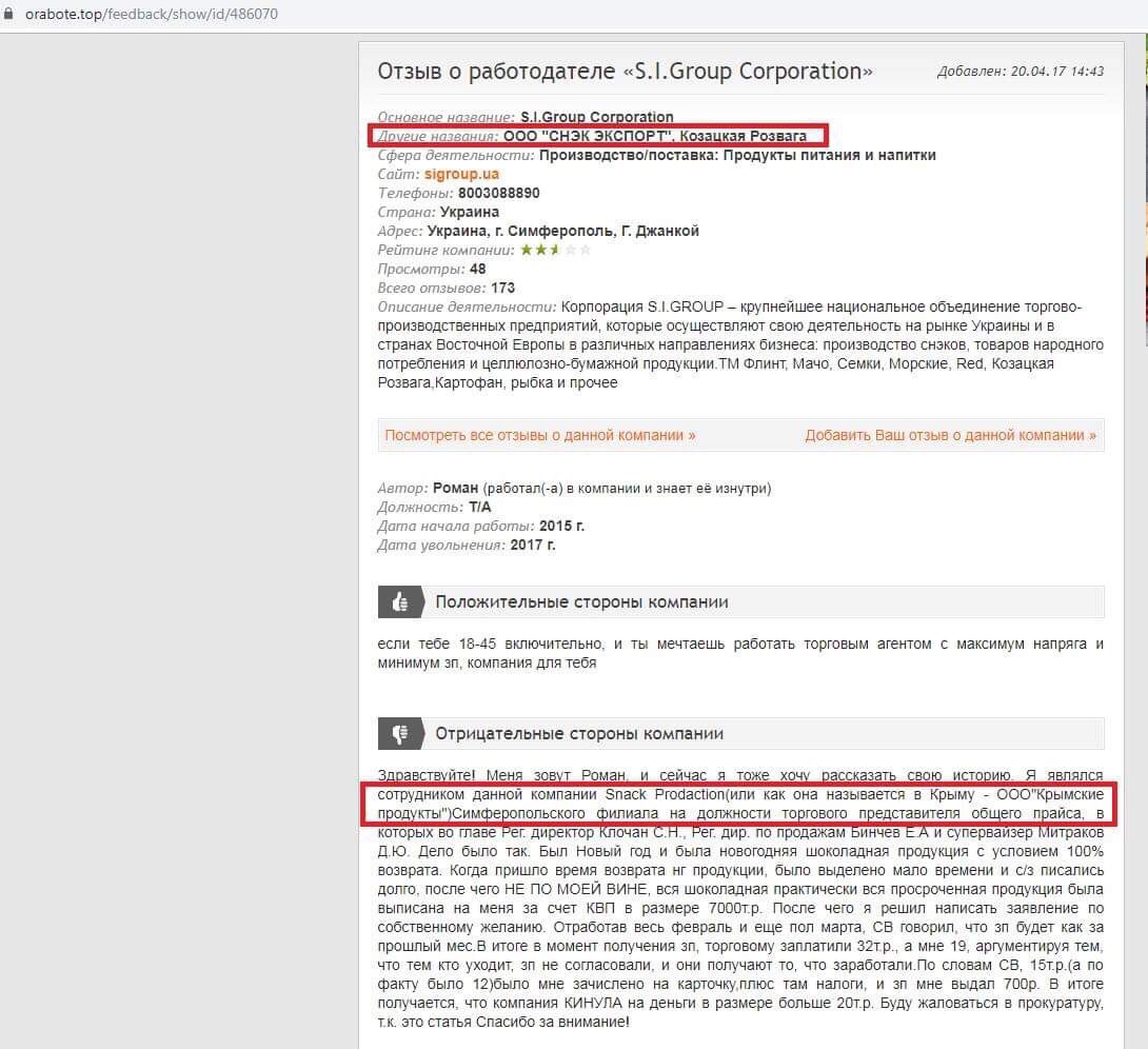 "Я являлся сотрудником данной компании Snack Prodaction (или как она называется в Крыму - ООО"Крымские продукты" ) Симферопольского филиала на должности торгового представителя общего прайса, в которых во главе рег. директор Клочан С.Н., Рег. дир. по продажам Бинчев Е.А и супервайзер Митраков Д. Ю.