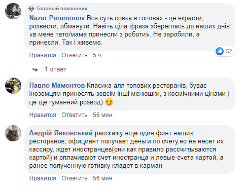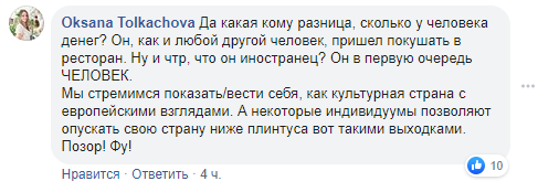"Да какая кому разница, сколько у человека денег? Он, как и любой другой человек, пришел покушать в ресторан. Ну и что, что он иностранец? Он в первую очередь человек", "Край разводил и убожества одновременно", "Совок в головах. Менталитет", "Гопничество и быдляцтво во всей красе", – написали в комментариях.
