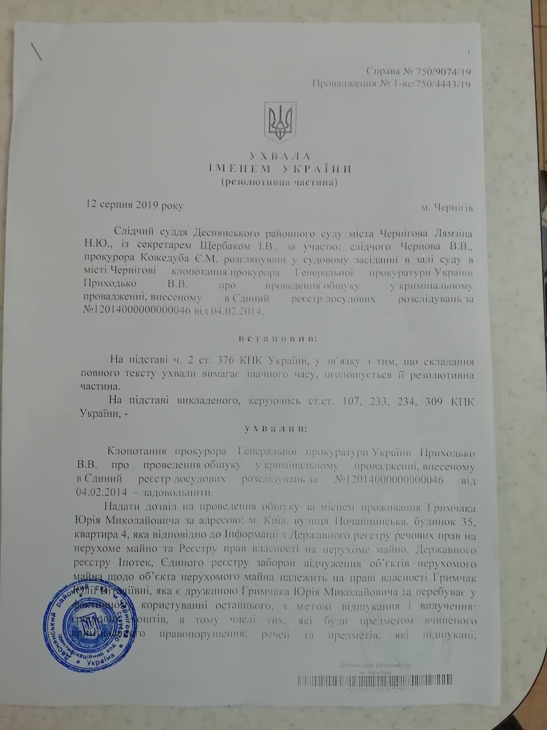 Первой об обыске в квартире Юрия Грымчака, которая находится по адресу Почайнинская, 35 сообщила жена заместителя министра – Юлия Гримчак. В 21:05 она написала на своей странице в Facebook.