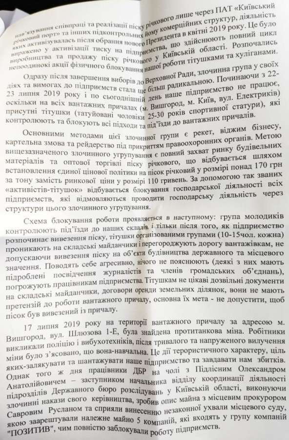 Як підтвердження, з його боку здійснюється тиск також на інші підприємства з метою встановлення єдиної відпускної оптової ціни на річковий пісок – замість нинішніх 110 гривень за тонну до 170-ти гривень. Різниця в 60 гривень з тонни – це той заробіток, який незаконним шляхом хочуть отримати ці ділки, вказує Валерій Шевчик.