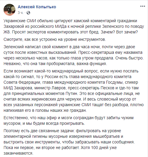 Блогер Алексей Копытько считает, что украинские СМИ зря уделяют столько внимания посту Захаровой.