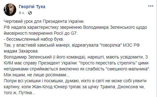 Заместитель министра по вопросам временно оккупированных территорий и внутренне перемещенных лиц Украины Георгий Тука назвал заявление Захаровой уроком для Зеленского.
