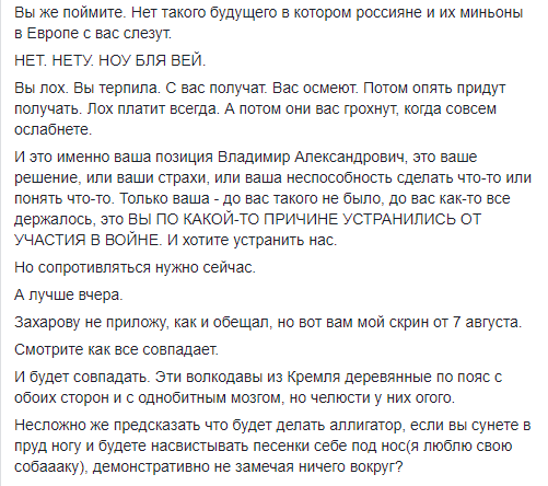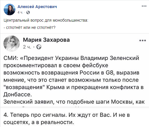 Политический и военный эксперт Алексей Арестович хочет увидеть реакцию Зеленского на пост Захаровой.