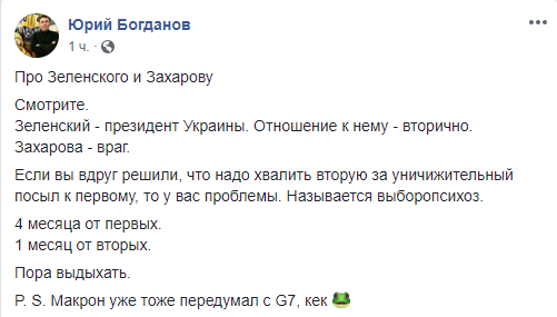 Блогер и общественный активист Юрий Богданов назвал людей, которые хвалят Захарову за уничижительный посыл к Зеленскому больными.