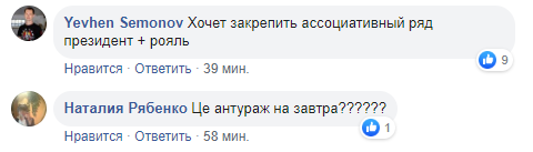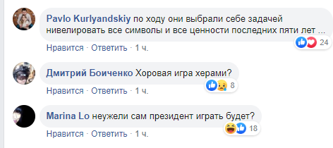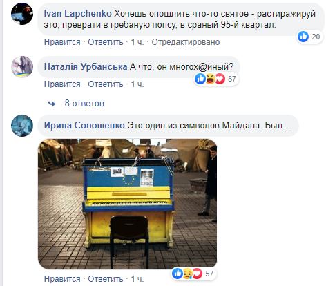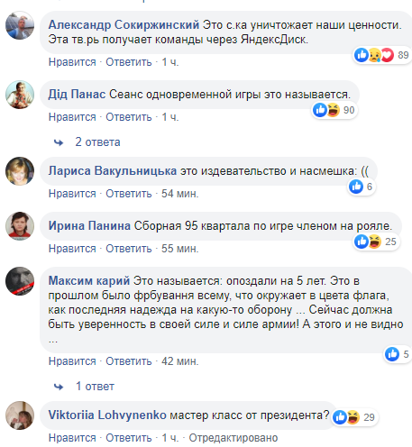 "Хочешь опошлить что-то святое – растиражируй это, преврати в гребаную попсу, в ср*ный "95-й квартал", "Эта с*ка уничтожает наши ценности. Эта тв*рь получает команды через ЯндексДиск", "Это издевательство и насмешка", "Сборная "95 квартала" по игре членом на рояле", "Мастер-класс от президента", "Они пока всё не обгадят, не успокоятся", "Кажется, кто-то хочет, чтобы воспоминания о Майдане стали шароварщиной", "Сыграют цюцюрками в унисон?" – написали в комментариях.