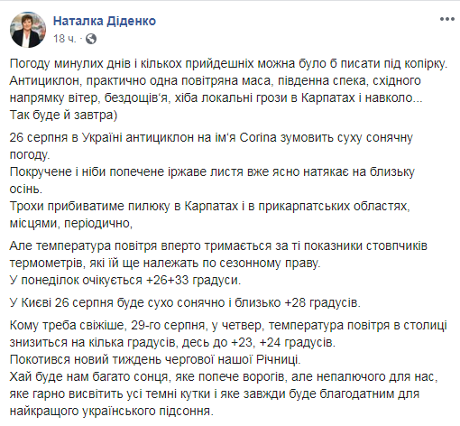 При этом синоптик Наталья Диденко на странице в Facebook предупредила, что небольшое похолодание придет в Киев, но в четверг, 29 августа. Температура воздуха опустится на несколько градусов.