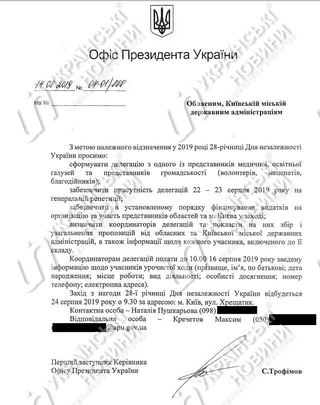 Об этом говорится в тексте письма Офиса Президента Украины областным администрациям, копия которого предоставлена ОПУ на информационный запрос «Українських Новин», передает сегодня издание.