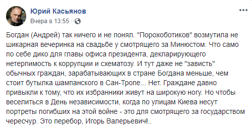 Глава Офиса Президента Андрей Богдан прокомментировал свое отсутствие на торжествах по случаю празднования Дня Независимости в Киеве неоднозначным постом в соцсети, вызвав немалое возмущение общественности.