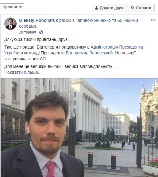 Сейчас Гончарук — заместитель главы Офиса президента, хотя еще в апреле он говорил, что «не понимает, кто такой Зеленский» и что больше поддерживает Порошенко.