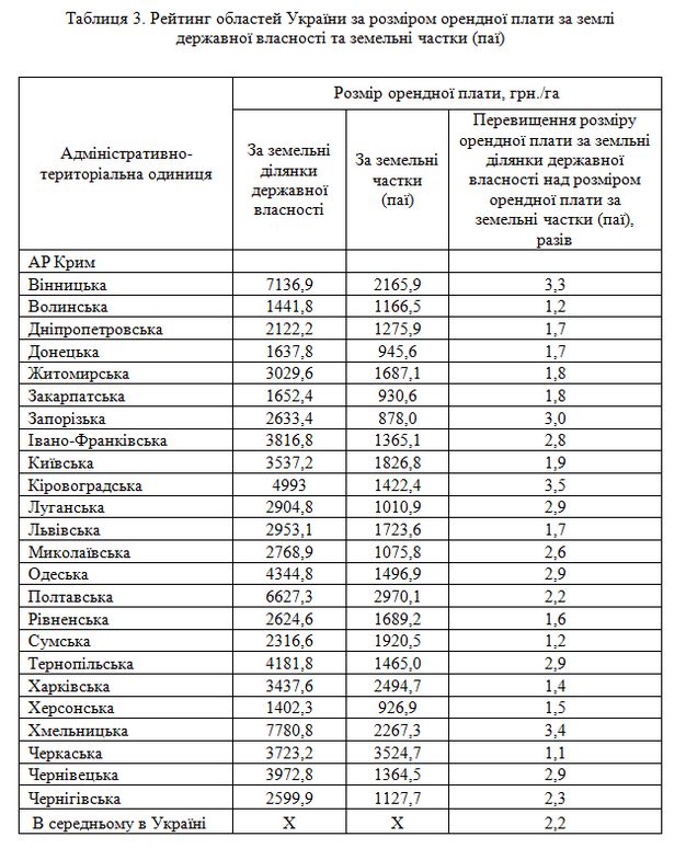 Размер арендной платы за земельные участки государственной собственности в среднем в Украине превышает размер арендной платы за земельные доли (паи) в 2,2 раза. В ряде областей этот показатель колеблется в пределах 3,0 — 3,5 раза (Таблица 3).