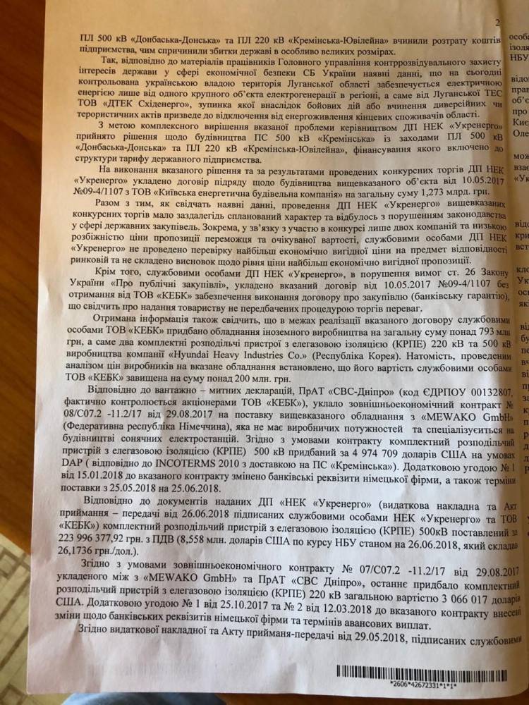 Кроме того, подстанцию все еще не построили, а «Киевская энергетическая строительная компания» потратила 793 млн гривен на иностранное оборудование. Речь шла о двух комплектных распределительных устройства Hyundai Heavy Industries Co. ( Южная Корея). По данным экспертам, стоимость оборудования умышленно завысили на 200 млн гривен, проведя закупку через подконтрольное ЧАО «СВС-Днепр». Распределители приобрели у MEWAKO GmbH, которая не имеет собственных мощностей и специализируется на строительстве солнечных электростанций.