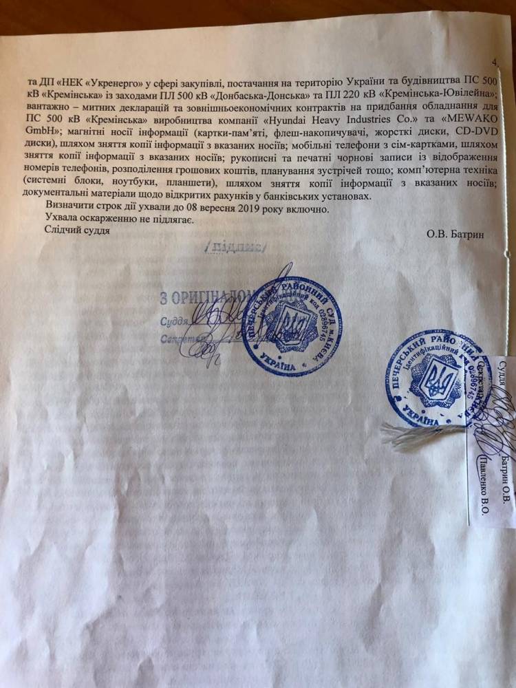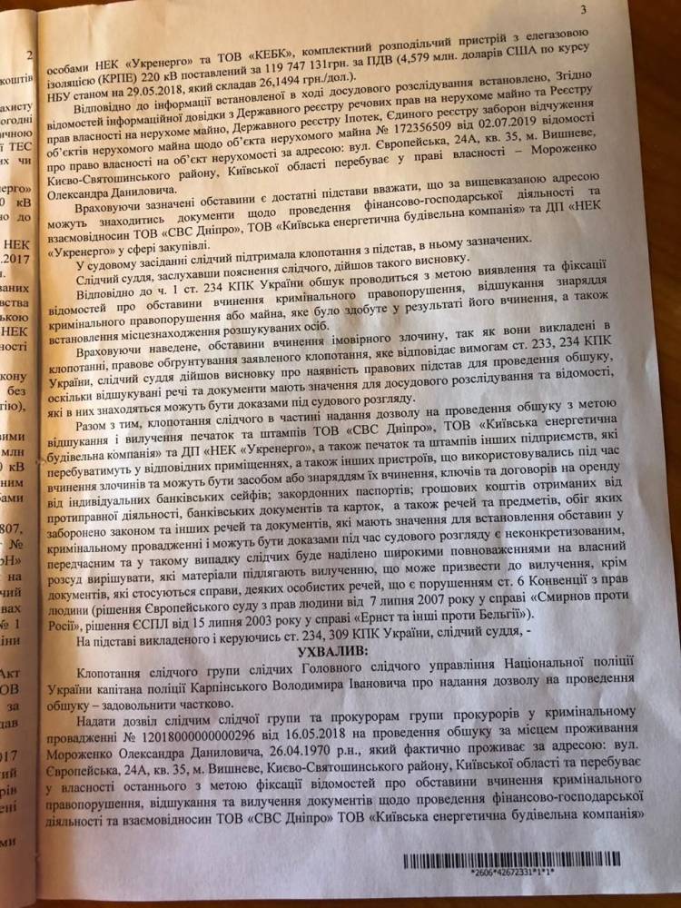 Следователи считают, что по месту жительства директора капстроительства Мороженко могут находиться документы о проведении финансово-хозяйственной деятельности взаимоотношений «СВС Днепр», «Киевской энергетической строительной компании» и ГП «НЭК«Укрэнерго» в сфере закупок, поставок и строительства подстанции.