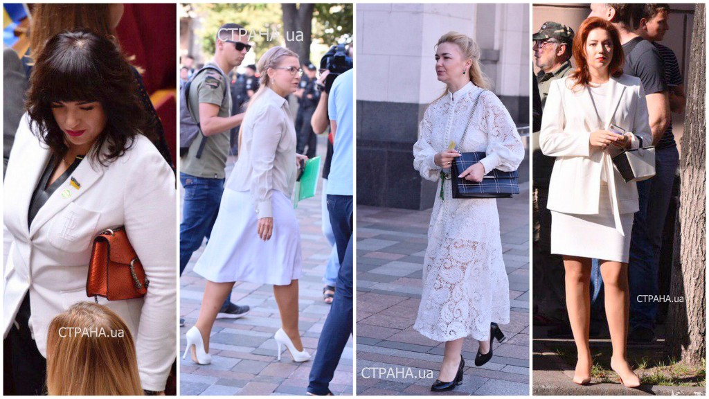 Многие женщины-депутаты для сегодняшнего торжественного заседания выбрали одежду белого цвета. Традиционно в белом была 58-летняя Юлия Тимошенко, лидер "Батькивщины, а ее соратница 31-летняя Алена Шкрум надела костюм молочного цвета. 36-летняя Елена Мошенец со "Слуги народа" пришла в кружевном белом платье. А еще в белом пиджаке американского бренда Ralph Lauren засветилась в парламенте 38-летняя Леся Забуранная (СН). Стоит такой около $250.