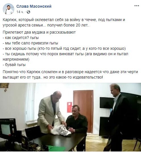 "Карпюк, который оклеветал себя за войну в Чечне, под пытками и угрозой ареста семьи... получил более 20 лет. Прилетают два мудака и рассказывают