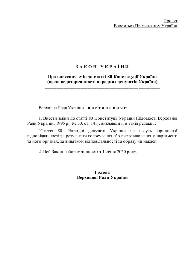 "Законопроектом предлагается изложить статью 80 Конституции Украины в новой редакции, отменяет положения, согласно которым народным депутатам Украины гарантируется депутатская неприкосновенность, народные депутаты Украины не могут быть без согласия Верховной Рады Украины привлечены к уголовной ответственности", – говорится в пояснительной записке к закону.