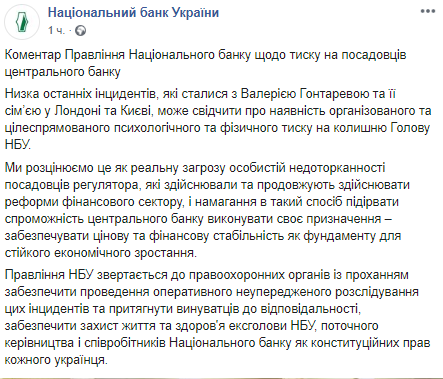 Добавим, что в НБУ заявили, что Правление Нацбанка обеспокоено последними инцидентами, которые произошли с Гонтаревой и ее семьей в Лондоне и Киеве.