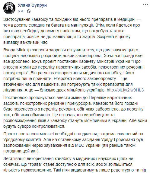 "Важно поддержать это постановление и распространять больше правдивой информации об использовании каннабиса в медицинских и научных целях", - заключила Супрун.
