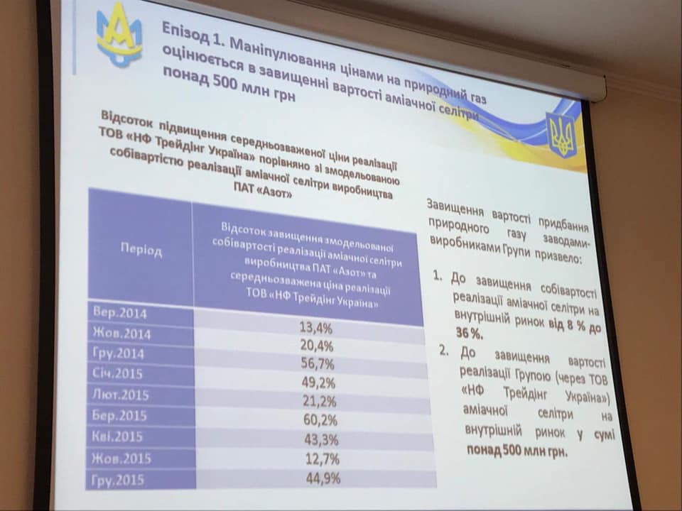 Согласно выводам АМКУ, в 2014 году азотные предприятия Фирташа занимали 61,01% на рынке продажи азотных удобрений. С тех пор их доля неуклонно падала, пока к 2017 году не опустилась к 35,45%, следует из презентации АМКУ, фотографии которой опубликовала Загребельская.