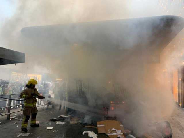 В ходе продолжающихся протестов в Гонконге протестующие устроили поджог на входе станции метро Central.