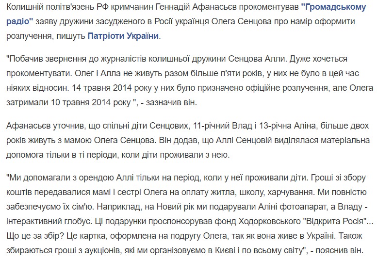 В частности, в 2016 году бывший политзаключенный РФ крымчанин Геннадий Афанасьев утверждал, что Олега арестовали буквально за несколько дней до развода с женой, та уже давно не живет с детьми и вымогает от семьи деньги, шантажируя их возможностью слива журналистам данных про Сенцова.