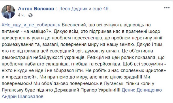 Третий участник «похода», начальник управления молодежи и спорта Луганской военно-гражданской администрации Антон Волохов тоже заявил: «Не иду и не собирался. Уверен, что все ожидают ответ на вопрос: «А зачем?». Спасибо всем, кто поддержал нас в стремлении привлечь внимание к проблемам переселенцев, к проблемам пересечения линии разграничения и, вообще, возвращение мира на нашу землю. Спасибо и тем, кто не поддержал этот своеобразный срез мнений луганчан. Это объективная демонстрация неравнодушия украинцев. Реакция на этот ролик показала, что проблема гораздо сложнее, глубже и серьезнее. Чтобы все поняли — никто никуда не идет и не собирался идти. Не делайте из нас «полезных идиотов» и «предателей». Мы стремимся к миру, но не ценой предательства!!! Мы вернемся! Мы обязательно вернемся в Луганск, только когда в Луганске будет поднят Государственный Флаг Украины!!!«