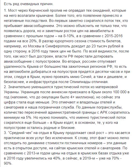 «За восемь месяцев Крым принял 700 тысяч отдыхающих, 600 тысяч из которых — жители РФ. Этот сезон стал худшим за последние три года. Мост не помог», — пишет на своей страничке в социальных сетях экс-министр туризма АРК Александ Лиев, проанализировавший открытые данные, касающиеся турпотоков.
