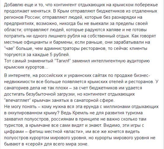 По его словам, «крымские власти» не постеснялись назвать туристический сезон «рекордным», заявив о 5,8 миллионов отдыхающих с начала этого года и 4,6 миллиона туристов, приехавших отдохнуть летом. «Жаль, что такие отчеты на хлеб намазать нельзя. Крымский турбизнес видит и понимает реальную картину и эта картина совсем другая. Реальные результаты летнего (пляжного) сезона стали неожиданностью даже для меня», — отмечает Александр Лиев и добавляет, что в довоенное время за восемь месяцев полуостров принимал свыше 5 миллионов туристов.