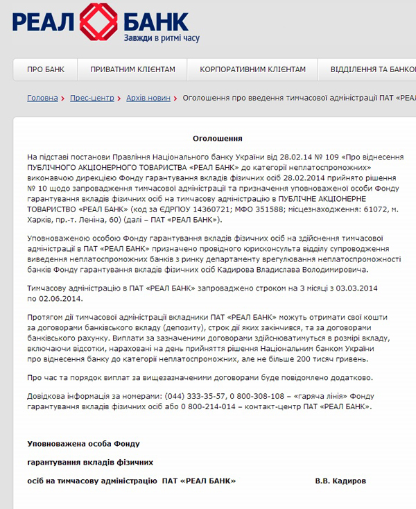 Аналогичная судьба постигла другой банк Курченко - харьковский "Реал Банк" из числа небольших. Вечером прошлой пятницы 28 февраля Фонд гарантирования вкладов физлиц ввел временную администрацию в оба финучреждения.