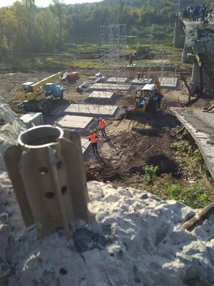 Работы у излома моста выполняют работники компании «Уктрансміст», инженерная и пиротехническая группа ГСЧС. Последняя обеспечивает очистку территории от взрывоопасных предметов.