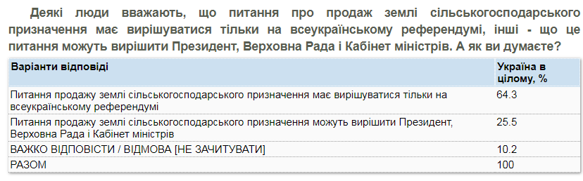64% участников опроса полагают, что вопрос о продаже земли сельхозназначения нужно вынести на всеукраинский референдум. 26% считают, что этот вопрос должны решать президент, Верховная Рада и Кабинет Министров. 10% не смогли ответить на вопрос.