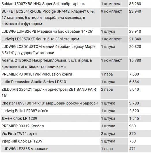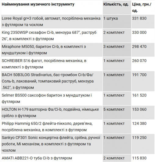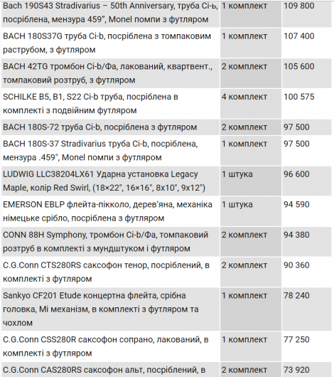 Самыми дорогими оказались гобой Loree Royal gr+3 автомат с посеребренной механикой, футляром и чехлом за 332 тыс. грн. и два сюзафона King с футляром по 330 тыс. грн.