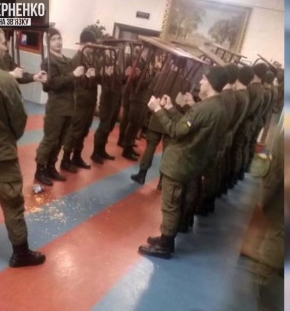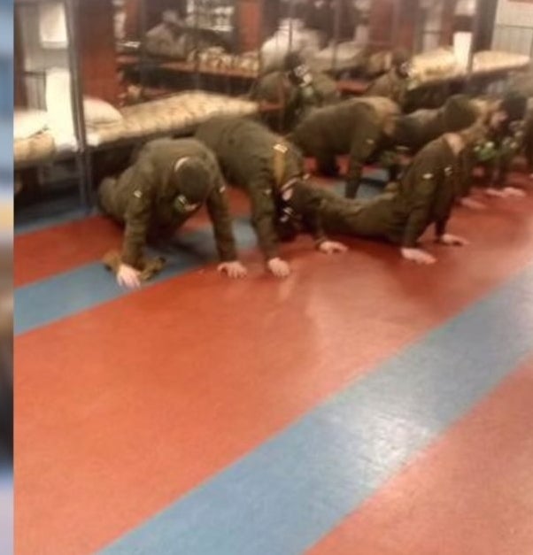На одном из ниже опубликованных фото, по словам активиста, курсантов наказали держанием стульев на весу из-за чипсов, найденных сержантом в тумбочке.